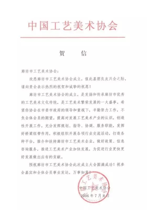中國工藝美術協(xié)會發(fā)來賀信