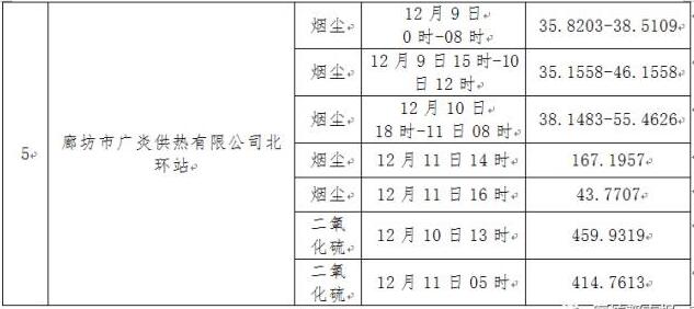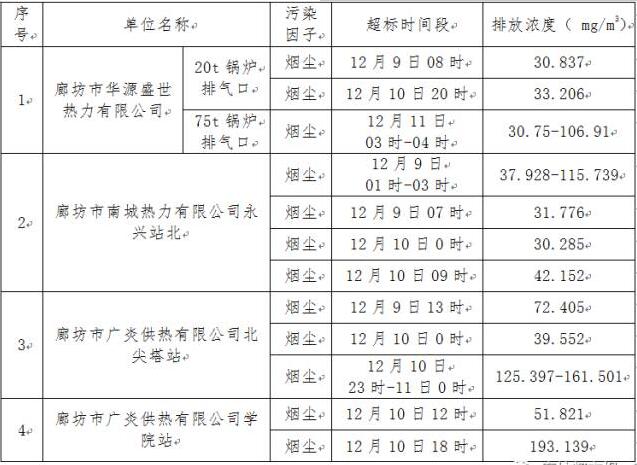 12月9日0時至11日16時廊坊恒盛供熱有限公司、廊坊市匯源熱力有限公司站和廊坊市開發(fā)區(qū)耀邦熱力有限公司排放達標;廊坊市華源盛世熱力有限公司、廊坊市南城熱力有限公司永興站北和廊坊市廣炎供熱有限公司3家公司5個熱力站均超標排放。