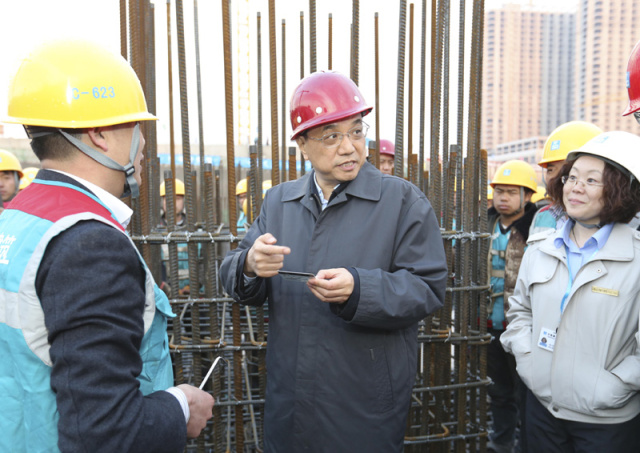 22日,在赤峰污水處理項目工地,李克強走上腳手架與農民工交談。他說,你們?yōu)槌鞘械厣瞎こ特暙I了力量,現(xiàn)在又做地下工程,為長久發(fā)展打基礎,你們是城市建設的雙功臣。城市地下設施歷史欠賬多,未來要做更多地下工程,你們把這方面的技術學好,將來會有更多活干!