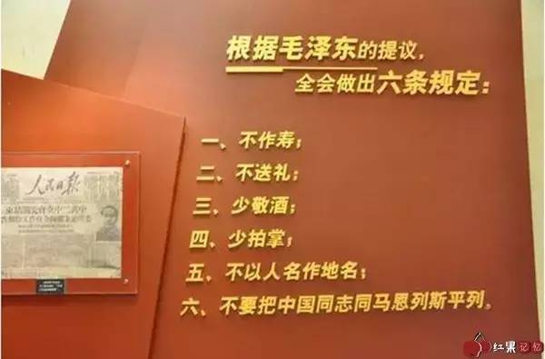 在西柏坡紀(jì)念館內(nèi),有這樣一塊展板,上面寫(xiě)著“根據(jù)毛澤東的提議,全會(huì)作出六條規(guī)定:一、不做壽;二、不送禮;三、少敬酒;四、少拍掌;五、不以人名作地名;六、不要把中國(guó)同志同馬恩列斯平列。”這是當(dāng)年對(duì)中國(guó)共產(chǎn)黨人定下的規(guī)矩。