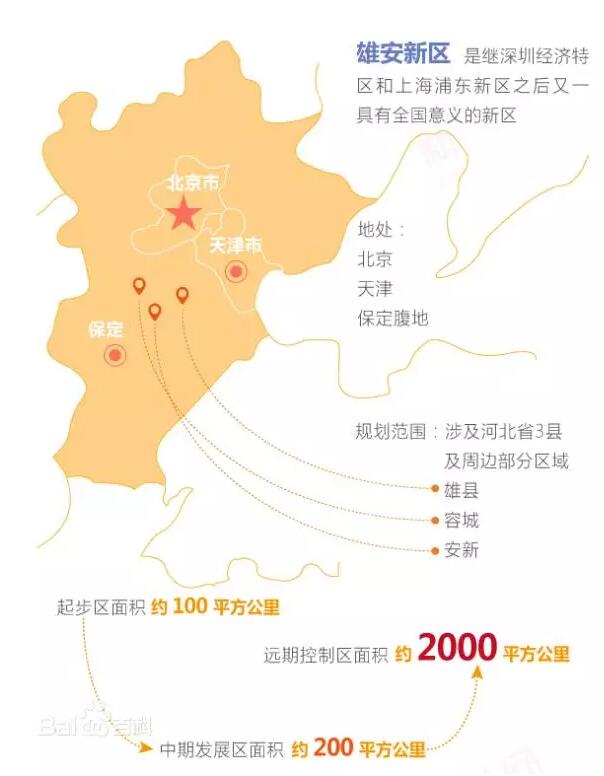 近日,中共中央、國(guó)務(wù)院印發(fā)通知,決定設(shè)立河北雄安新區(qū)。雄安新區(qū)規(guī)劃范圍涉及中國(guó)河北省雄縣、容城、安新3縣及周邊部分區(qū)域,地處北京、天津、保定腹地,起步區(qū)面積約100平方公里,遠(yuǎn)期控制區(qū)面積約2000平方公里。