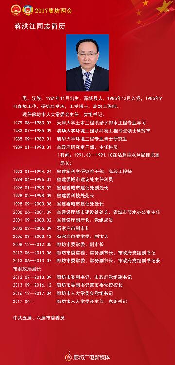 4月14日舉行的廊坊市七屆人大一次會(huì)議第四次全體會(huì)議,選舉蔣洪江為市人大常委會(huì)主任,選舉王俊臣、王相仁、陳洪波、王永威、邵二玲為市人大常委會(huì)副主任,選舉畢忠慶為秘書長。