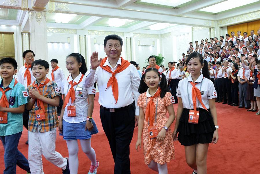 2015年6月1日,習(xí)近平在北京人民大會堂親切會見中國少年先鋒隊(duì)第七次全國代表大會全體代表。新華社記者王曄攝