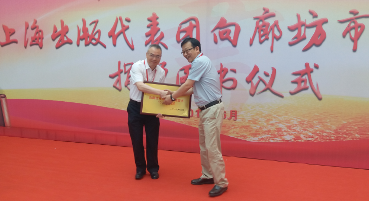 在捐贈(zèng)儀式上,李遠(yuǎn)濤先生代表上海出版代表團(tuán)向廊坊市圖書(shū)館贈(zèng)送圖書(shū)和牌匾,廊坊市文廣新局黨組書(shū)記李克儉、廊坊市圖書(shū)館副館長(zhǎng)甘義代表廊坊市圖書(shū)館接收。