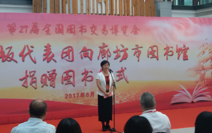 捐贈(zèng)牌匾后,廊坊市人民政府副市長(zhǎng)張春燕同志在儀式上致辭:“上海與廊坊市淵源頗深,上海出版代表團(tuán)向我市圖書(shū)館捐贈(zèng)圖書(shū),這不僅極大豐富了我市圖書(shū)館藏書(shū),更增進(jìn)了上海和廊坊兩地人民的情誼。因此向上海出版代表團(tuán)的捐贈(zèng)義舉致以最誠(chéng)摯的謝意。同時(shí),希望廊坊市圖書(shū)館的團(tuán)體工作人員為廣大讀者做好服務(wù),為百姓搭建更好多的閱讀平臺(tái)。”