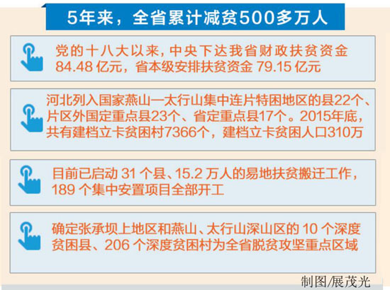 黨的十八大以來,全省平均每年減貧100萬人左右;貧困發(fā)生率從2013年底的9.84%下降到2016年底的3.89%,下降5.95個百分點。其中,燕山—太行山的貧困人口由218.89萬人,減少到76.85萬人。與此同時,貧困群眾生活水平明顯提高,貧困地區(qū)基礎設施明顯改善。