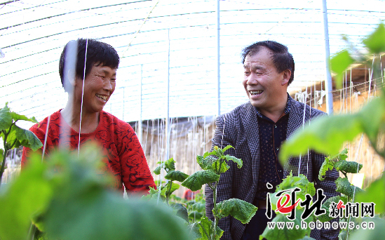阜城縣扶貧辦主任李雙星(右)為棚菜種植戶講解瓜菜技術