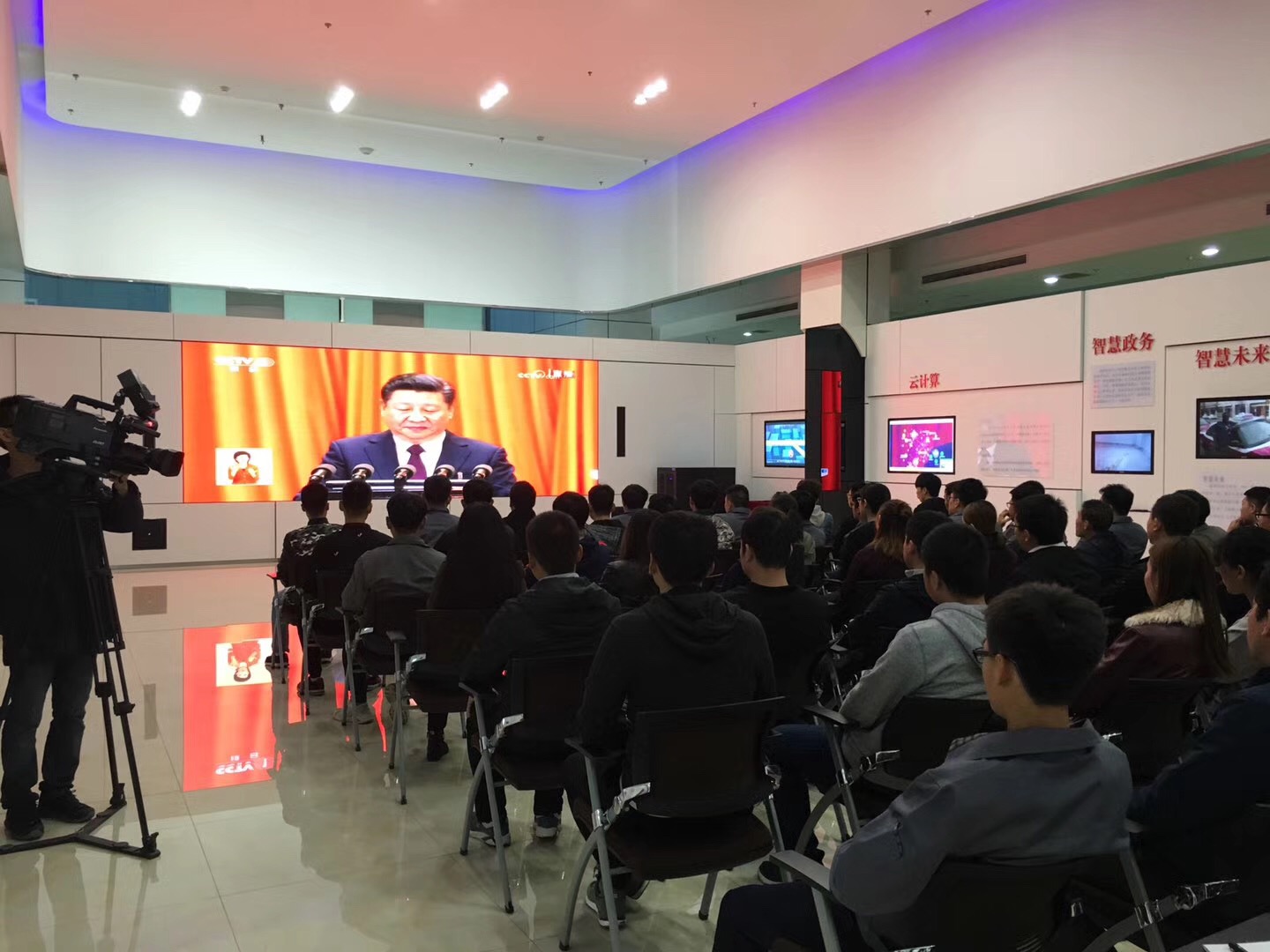 今天一上班,公司的員工就早早的來到大數(shù)據(jù)應(yīng)用展示中心的大廳,期待黨的十九大開幕。