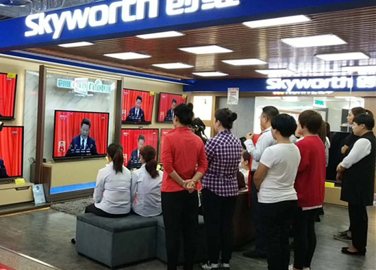 摘要: 在明珠大廈五樓電視銷售區(qū),這里所有的電視品牌都在播放十九大開幕式,很多顧客和員工都駐足觀看直播。通過觀看開幕式現(xiàn)場直播,大家熱血...