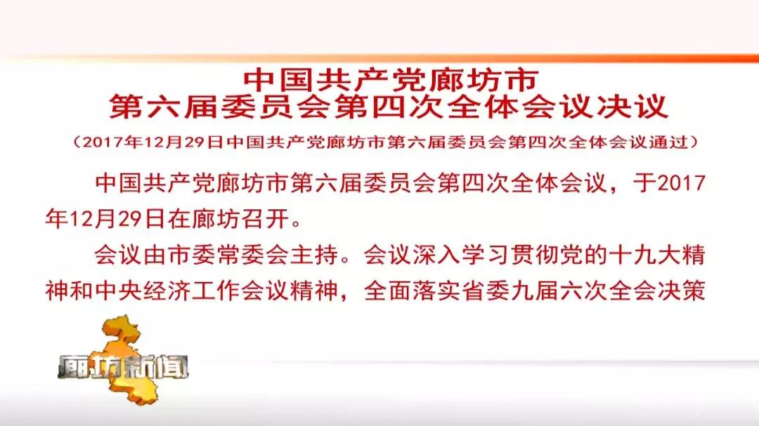中國共產(chǎn)黨廊坊市第六屆委員會第四次全體會議,于2017年12月29日在廊坊召開。