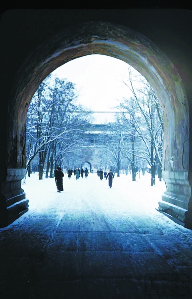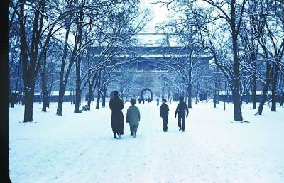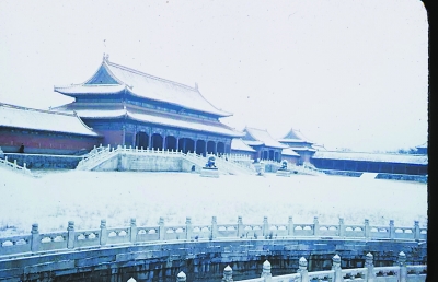 透過天安門城樓中間的門洞向北看,可見端門。從端門的門洞又可以看到午門的門洞。一門套一門,層層鎖“深宮”。然而“深宮”已經(jīng)不再是神秘的大內(nèi)禁苑。1924年末代皇帝溥儀出宮,次年故宮博物院成立,任何買了門票的民眾都可以去參觀。照片中盡管大雪紛飛,但仍沒有阻止游人的腳步,地上的積雪已經(jīng)被踩出一條黑漆漆的路。
