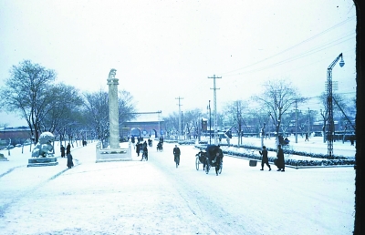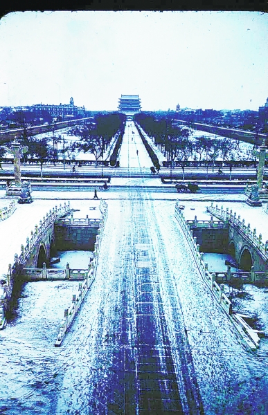 大雪過后,北平一片銀裝素裹,空氣干冷。站在正陽門城樓上向北遠(yuǎn)眺紫禁城,灰暗的天空被積雪反射的陽光照亮,本來金碧輝煌的屋頂全都變成白色。曾經(jīng)神秘的千步廊在進(jìn)入民國后已經(jīng)改建為公園,大清門也易名“中華門”,一條在雪中被踩出的黑色道路直通中門。昔日只有皇帝能走的中門,已向所有的民眾敞開。