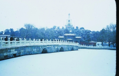進(jìn)入北海公園南門,正對著的就是海子里的瓊?cè)A島以及永安寺,一座石橋飛架水面之上,連接島與岸。橋南有坊額“積翠”,橋北有坊額“堆云”,所以這橋又被稱為“堆云積翠橋”,過了這橋就是永安寺山門。夏天海子里開滿荷花,石橋好像浮在綠葉和粉花之上,而到了冬天,特別是雪后,萬物蕭條,北平城只剩下黑白灰三色,石橋則涂抹出一番橫亙的古意。