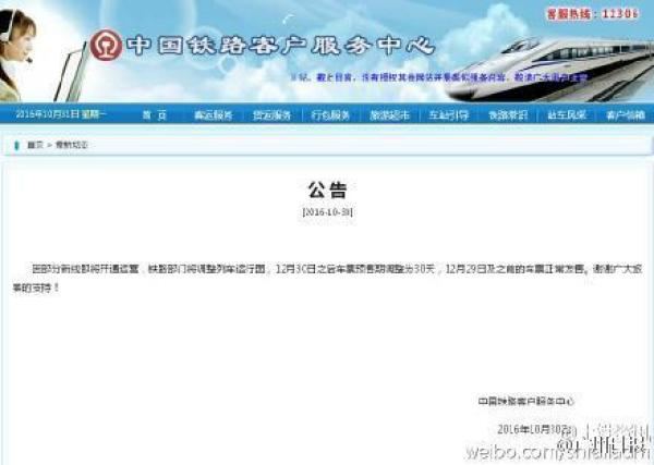 央視網消息:中國鐵路客戶服務中心12306網站今天發(fā)布公告,自12月30日(車票票面乘車日期)之后,全國鐵路部門旅客列車車票預售期調整為30天,12月29日及之前的車票正常發(fā)售。12月30日之后火車票預售期調整為30天,其中, 互聯(lián)網、手機、電話訂票預售期為30天;各車站、代售點、自動售票機預售期為28天。恢復60天預售期時間另行通知。 這次車票預售期調整的原因,是由于全國鐵路部分新線即將開通運營,屆時,鐵路部門將調整列車運行圖。