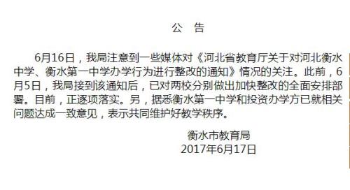 衡水市教育局公告表示,已對兩校分別做出加快整改的全面安排部署。目前,正逐項落實。另外,據(jù)悉衡水第一中學(xué)和投資辦學(xué)方已就相關(guān)問題達成一致意見,表示共同維護好教學(xué)秩序。