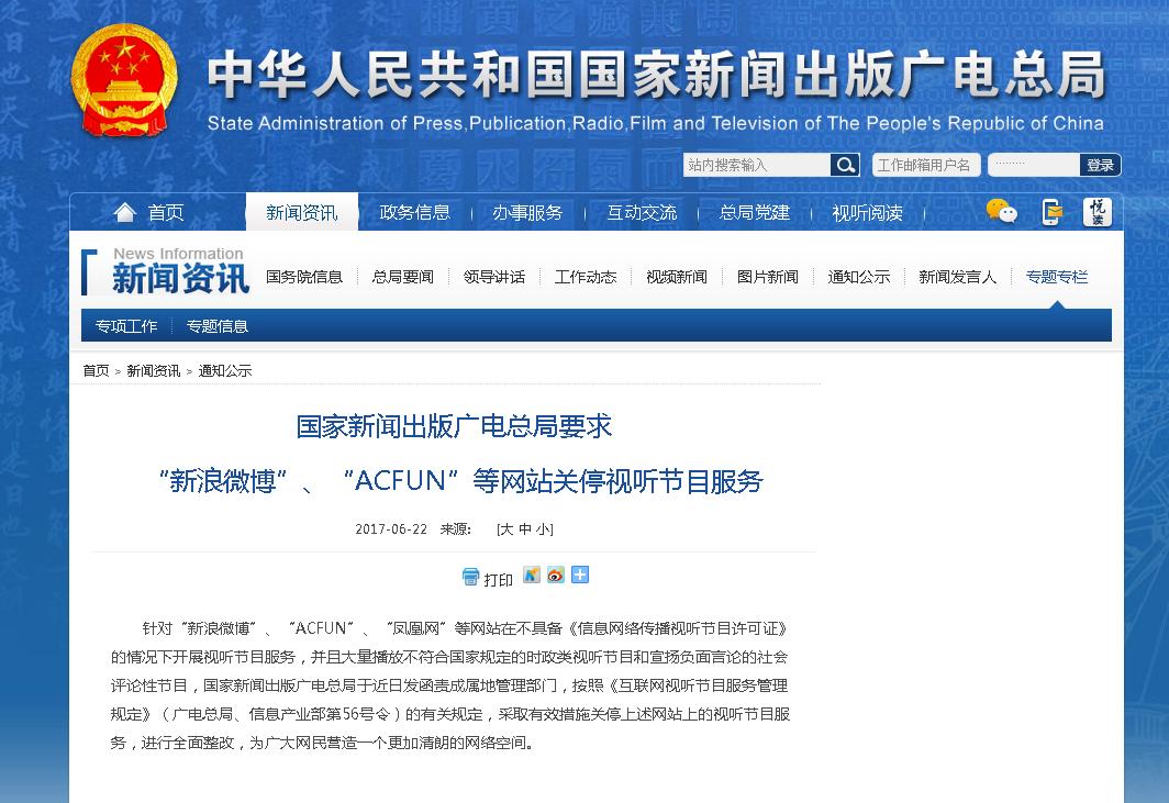 央視網(wǎng)消息:據(jù)國家新聞出版廣電總局網(wǎng)站消息,針對“新浪微博”、“ACFUN”、“鳳凰網(wǎng)”等網(wǎng)站在不具備《信息網(wǎng)絡(luò)傳播視聽節(jié)目許可證》的情況下開展視聽節(jié)目服務(wù),并且大量播放不符合國家規(guī)定的時政類視聽節(jié)目和宣揚負(fù)面言論的社會評論性節(jié)目,國家新聞出版廣電總局于近日發(fā)函責(zé)成屬地管理部門,按照《互聯(lián)網(wǎng)視聽節(jié)目服務(wù)管理規(guī)定》(廣電總局、信息產(chǎn)業(yè)部第56號令)的有關(guān)規(guī)定,采取有效措施關(guān)停上述網(wǎng)站上的視聽節(jié)目服務(wù),進(jìn)行全面整改,為廣大網(wǎng)民營造一個更加清朗的網(wǎng)絡(luò)空間。