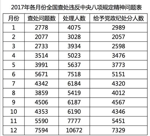 從2017年各月份全國查處違反中央八項(xiàng)規(guī)定精神問題表可以發(fā)現(xiàn),自2017年6月起,“四風(fēng)”問題反彈趨勢(shì)突然增強(qiáng),一下子從前5個(gè)月平均3000起左右上升到4500起左右,受處理人數(shù)和受黨紀(jì)政紀(jì)處分人數(shù)也明顯增加。而12月份的數(shù)字更是陡增,查處問題數(shù)、受處理人數(shù)和受黨紀(jì)政紀(jì)處分人數(shù)相當(dāng)于2017年第一季度的總和。