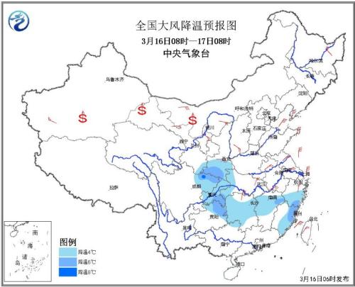 中央氣象臺3月16日06時繼續(xù)發(fā)布寒潮藍色預(yù)警:受冷空氣影響,預(yù)計16日,陜西南部、湖北西部、西南地區(qū)東部、江南中部和東南部等地氣溫將下降4~6℃,部分地區(qū)降溫幅度可達8℃。日最低氣溫0℃線將位于黃淮東部、華北南部等地。
