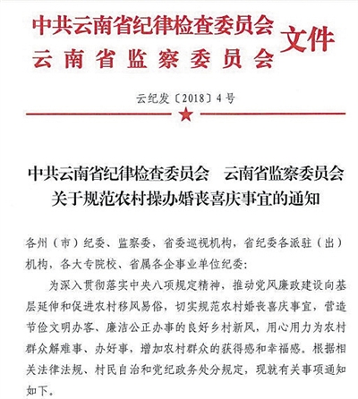 近日,云南省紀(jì)委、監(jiān)察委下發(fā)了《關(guān)于規(guī)范農(nóng)村操辦婚喪喜慶事宜的通知》(下稱《通知》),明確云南省農(nóng)村地區(qū)除為本人及子女操辦婚事,為直系親屬操辦喪事外,一律不操辦客事。
