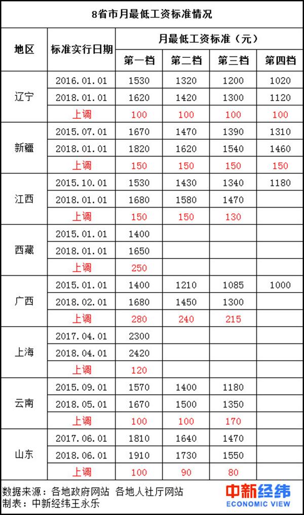 公開資料顯示,除上述8省市外,如相關(guān)政策無調(diào)整,廣東、四川、安徽最低工資標(biāo)準(zhǔn)也將在2018年上調(diào)。