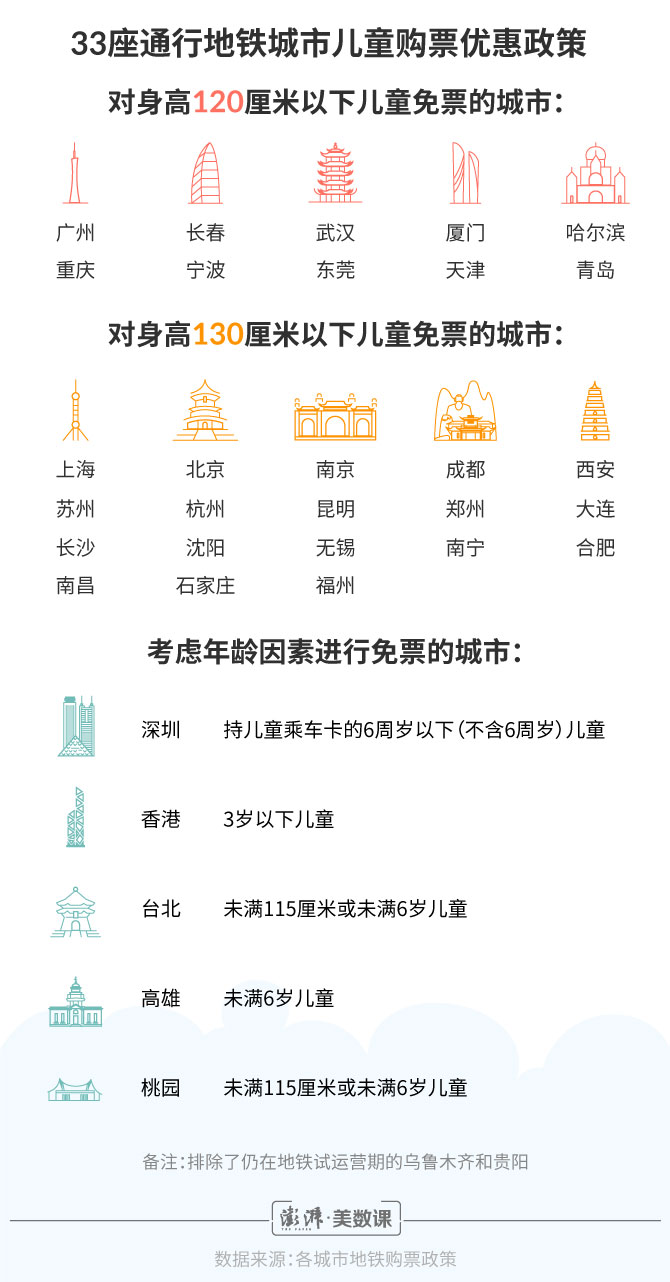 考慮到兒童身高的增長問題,北京、上海等18座城市的地鐵部門已將兒童免票的身高線提升至130厘米 。深圳、臺(tái)灣、香港最為特殊,在購票政策中納入了年齡標(biāo)準(zhǔn)。