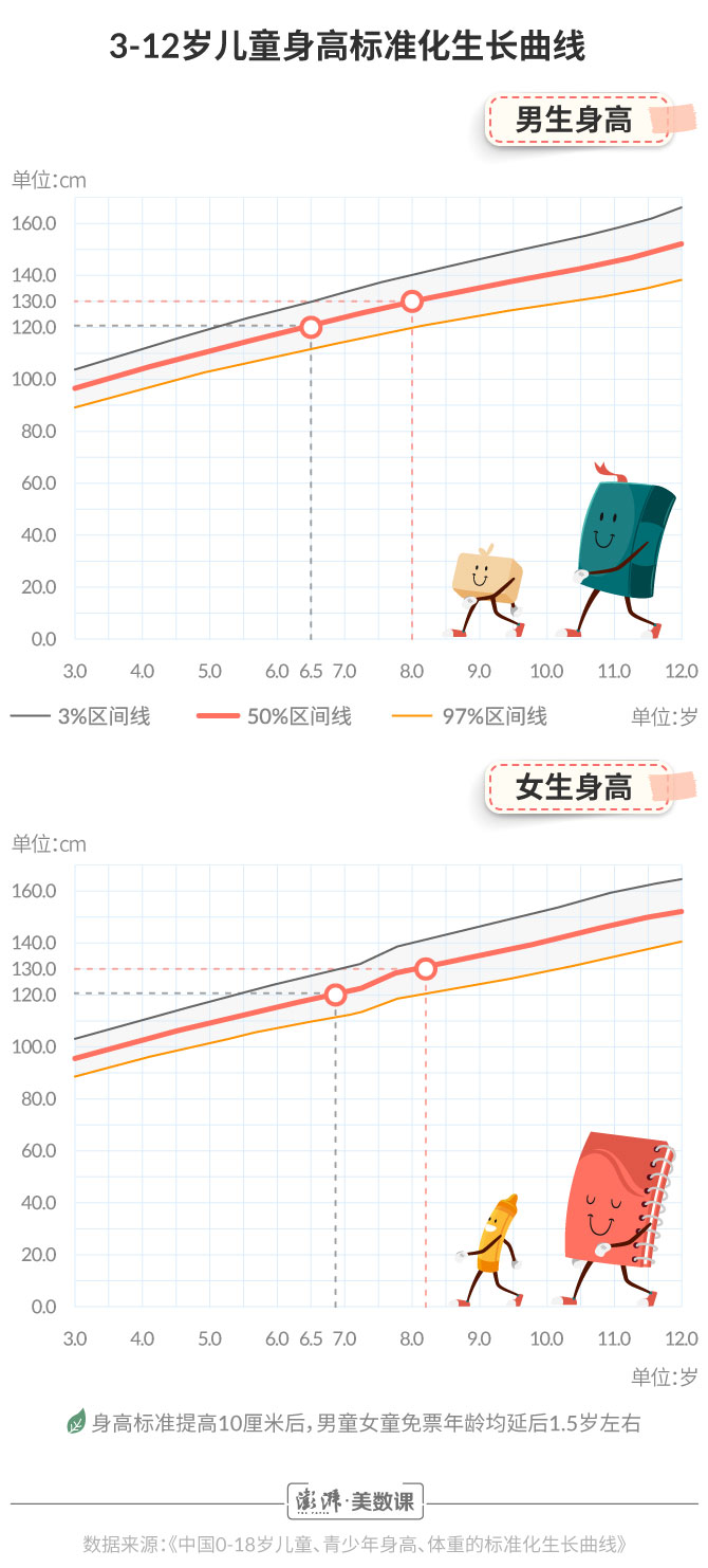 參考兒童身高的增長趨勢將標(biāo)準(zhǔn)線提高至130厘米,相較120厘米而言,是一個(gè)更為合理的選擇。參照首都兒科研究所生長發(fā)育研究室和北京大學(xué)兒童青少年衛(wèi)生研究所共同發(fā)布的《中國0-18歲兒童、青少年身高、體重的標(biāo)準(zhǔn)化生長曲線》,截取其中3-12歲兒童的身高數(shù)據(jù),可以發(fā)現(xiàn):身高線被拉高10厘米后,享受免票優(yōu)惠的兒童年齡范圍大約被拓寬了1.5歲 。