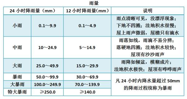 在氣象上通常用某一段時間內降水量的多少來劃分降水強度。根據國家氣象部門規(guī)定的降水量標準,降雨可分為小雨、中雨、大雨、暴雨、大暴雨和特大暴雨六種。