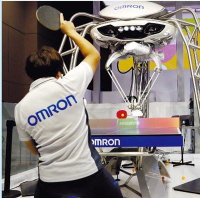 工作人員在歐姆龍展臺與機器人打乒乓球。