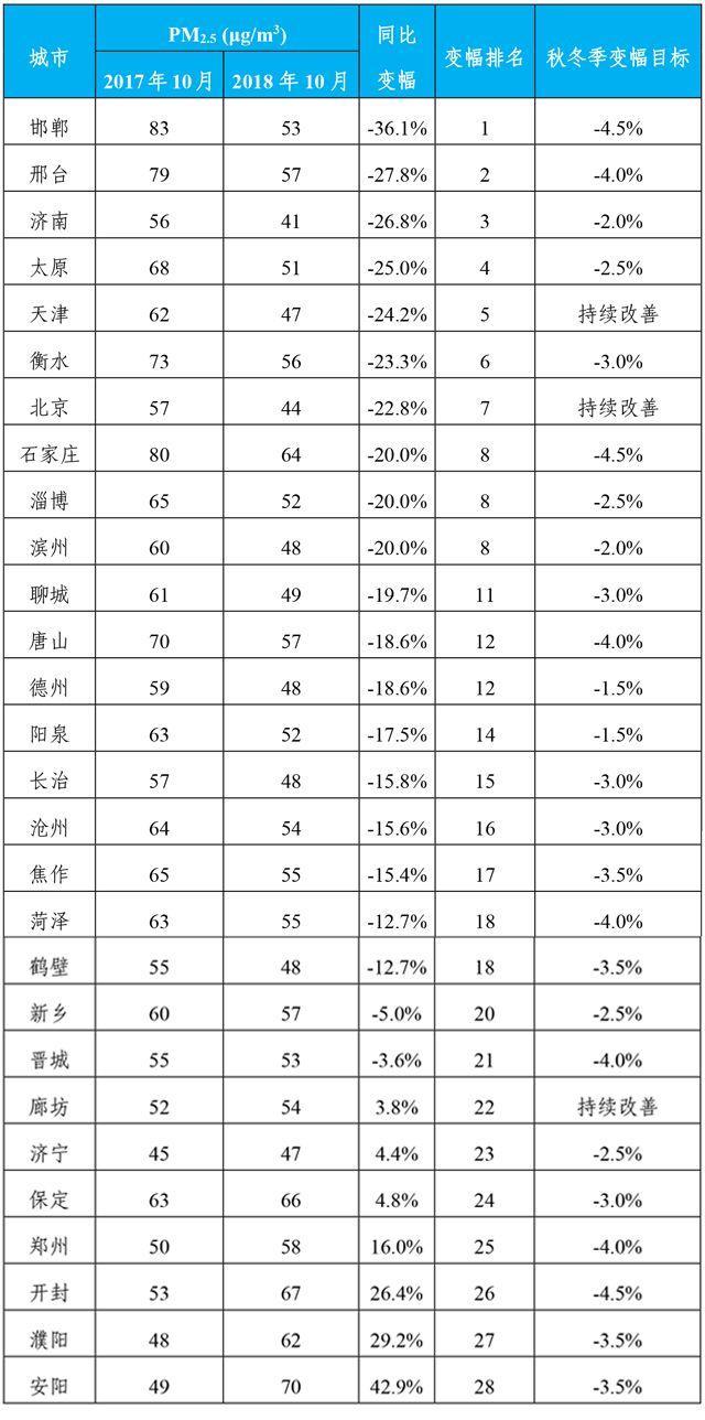 “2 26”城市2018年10月PM2.5平均濃度及同比變幅排名