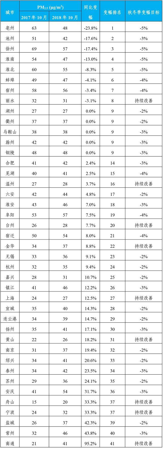 長三角地區(qū)41個城市2018年10月PM2.5濃度范圍為20~57 μg/m3,平均為40 μg/m3,同比上升5.3%。PM2.5平均濃度最低的4個城市是舟山、黃山、上海和湖州(并列第3),分別為20 μg/m3、26μg/m3、27 μg/m3、27 μg/m3;濃度最高的3個城市是阜陽、徐州和宿州,分別為57 μg/m3、57 μg/m3和56 μg/m3。從改善幅度看,8個城市PM2.5平均濃度同比下降,其中7個城市PM2.5平均濃度降幅滿足秋冬季改善目標(biāo)進(jìn)度要求;降幅排名前3位的亳州、池州和徐州,同比分別下降了23.8%、17.6%和17.4%。5個城市PM2.5濃度同比持平。28個城市同比不降反升,反彈幅度最大的3個城市為南通、常州和鹽城,同比分別上升95.2%、43.8%和42.3%。