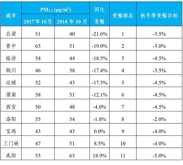 汾渭平原2018年10月PM2.5平均濃度及同比變幅排名