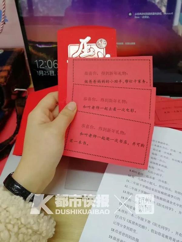 仔細閱讀每個“紅包”上的內(nèi)容,可以看出葉老師的初衷,是為了學生的全面發(fā)展。除了減免一項語文寒假作業(yè)、和葉老師一起去看一次電影、得到一個葉老師牌愛的抱抱之類的幸運獎,更多的是,做一天清潔小超人、做爸爸媽媽的小助手、制作PPT等考驗學生“德智體美勞”的作業(yè)。