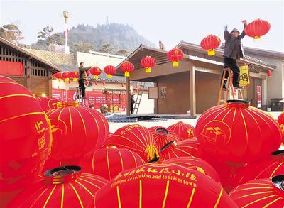 春節(jié)前,西柏坡紅旅小鎮(zhèn)工作人員將一個個大紅燈籠高高掛起,張燈結(jié)彩慶新春。 記者 趙海江攝