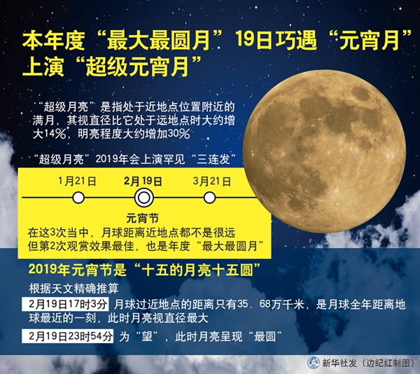 19日,元宵節(jié)。今年元宵節(jié)是“十五的月亮十五圓”。根據(jù)天文精確推算,19日17時(shí)3分月球過(guò)近地點(diǎn)的距離只有35.68萬(wàn)千米,是月球全年距離地球最近的一刻,此時(shí)月亮視直徑最大。23時(shí)54分為“望”,此時(shí)月亮呈現(xiàn)“最圓”。