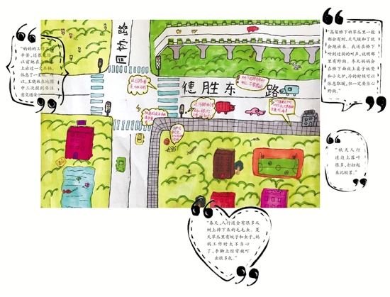 這個細心姑娘把平時觀察到的細節(jié)全畫在了地圖中。比如哪些地方有野狗,哪里的垃圾落葉比較多,哪個路口要注意交通安全。