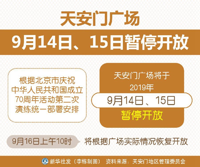 記者從天安門(mén)地區(qū)管理委員會(huì)獲悉,根據(jù)北京市慶祝中華人民共和國(guó)成立70周年活動(dòng)第二次演練統(tǒng)一部署安排,天安門(mén)廣場(chǎng)將于2019年9月14日、15日暫停開(kāi)放。9月16日上午10時(shí),將根據(jù)廣場(chǎng)實(shí)際情況恢復(fù)開(kāi)放。