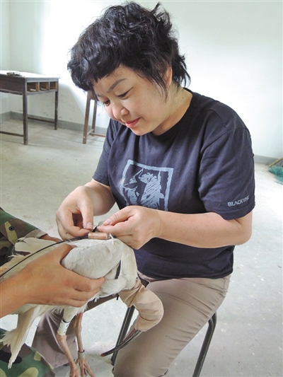 9月10日,救護(hù)人員正在給受傷的朱鹮89B治療傷處。