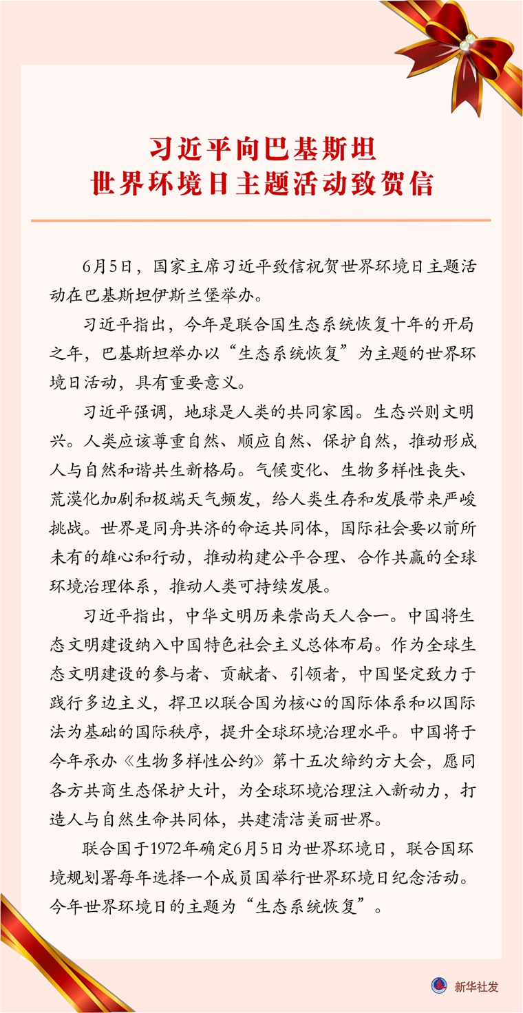 6月5日,國家主席習近平致信祝賀世界環(huán)境日主題活動在巴基斯坦伊斯蘭堡舉辦。