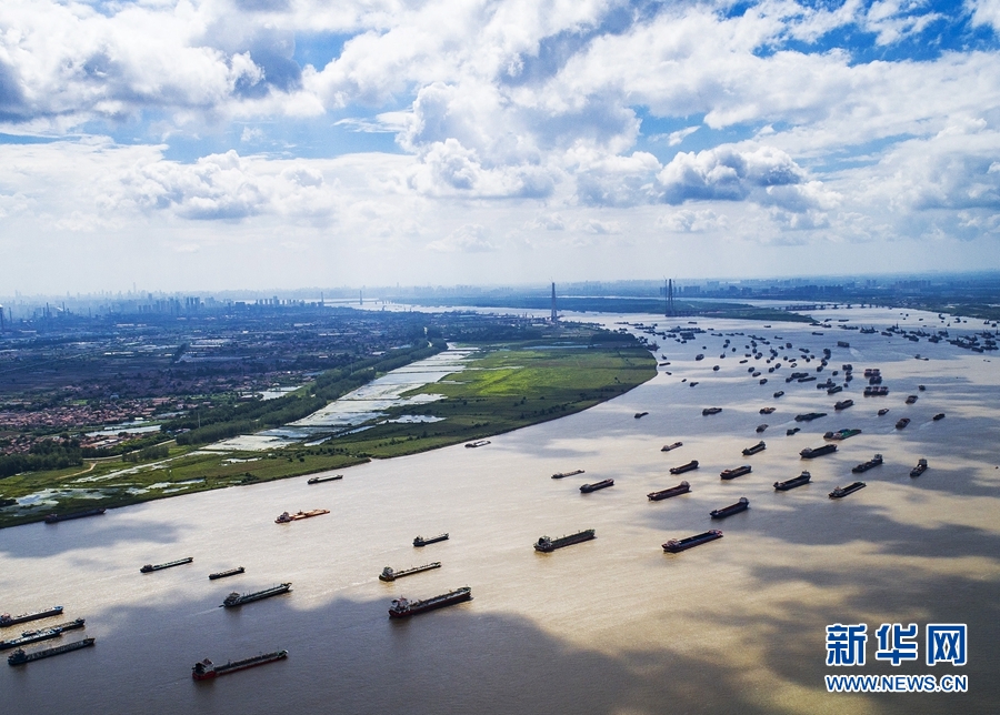 船舶在湖北省武漢市陽邏港區(qū)水域行駛(2018年8月13日攝,無人機照片)。新華社記者 肖藝九 攝