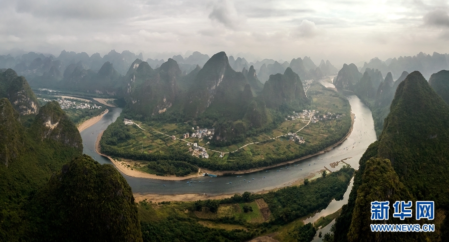 這是2018年10月18日拍攝的廣西桂林陽朔縣興坪鎮(zhèn)的漓江景色(無人機拼接照片)。新華社記者 李鑫 攝
