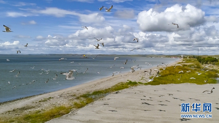 這是2019年8月28日拍攝的呼倫湖畔的水鳥(無人機照片)。新華社記者沈伯韓攝