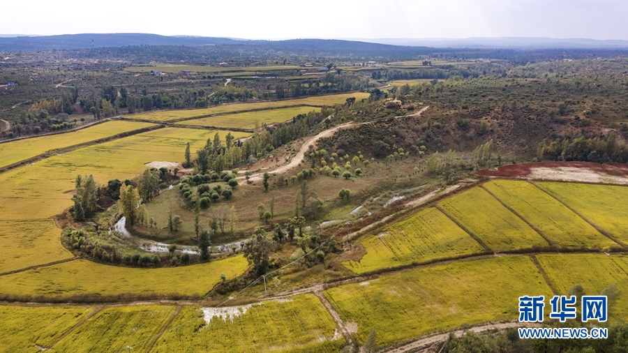 2020年9月26日拍攝的陜西省靖邊縣黃蒿界鎮(zhèn)馬季溝村稻田(無人機照片)。近年來,靖邊縣實施了“三北”防護林、退耕還林、流域治理等生態(tài)建設工程,北部沙漠區(qū)裸露明沙完全消失,中部農(nóng)田林網(wǎng)蔚然成蔭,南部山區(qū)夏季綠色滿山。新華社記者 陶明 攝