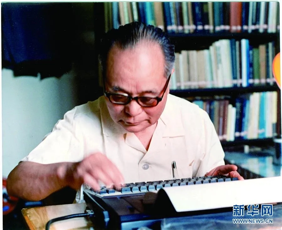 程開(kāi)甲在打字機(jī)上撰寫(xiě)論文(資料照片)。新華社發(fā)