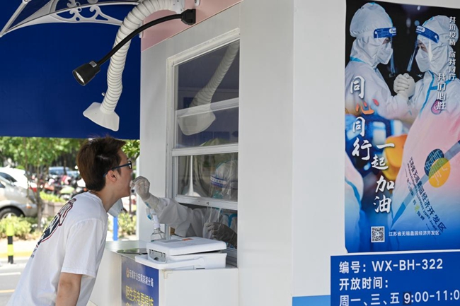 7月5日,在無(wú)錫市濱湖區(qū)蠡園街道的一處核酸采樣點(diǎn),一名市民在進(jìn)行核酸采樣。新華社記者 李博 攝