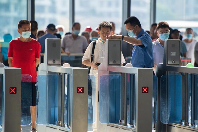 7月1日,在株洲火車(chē)站安檢區(qū),旅客進(jìn)行人臉識(shí)別通過(guò)安檢。新華社記者 陳思汗 攝