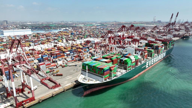 6月15日,山東港口青島港前灣港區(qū),集裝箱貨輪在碼頭裝卸集裝箱。新華社記者 李紫恒 攝