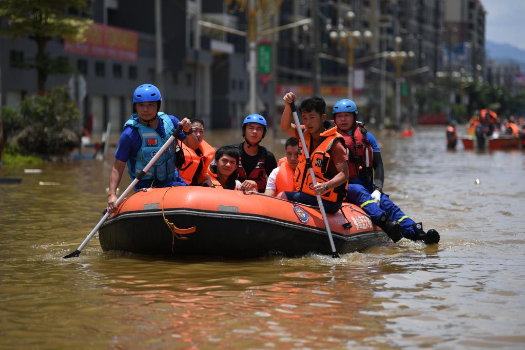 6月23日,在廣東清遠(yuǎn)英德市浛洸鎮(zhèn),救援人員用橡皮艇轉(zhuǎn)移群眾。新華社記者 鄧華 攝