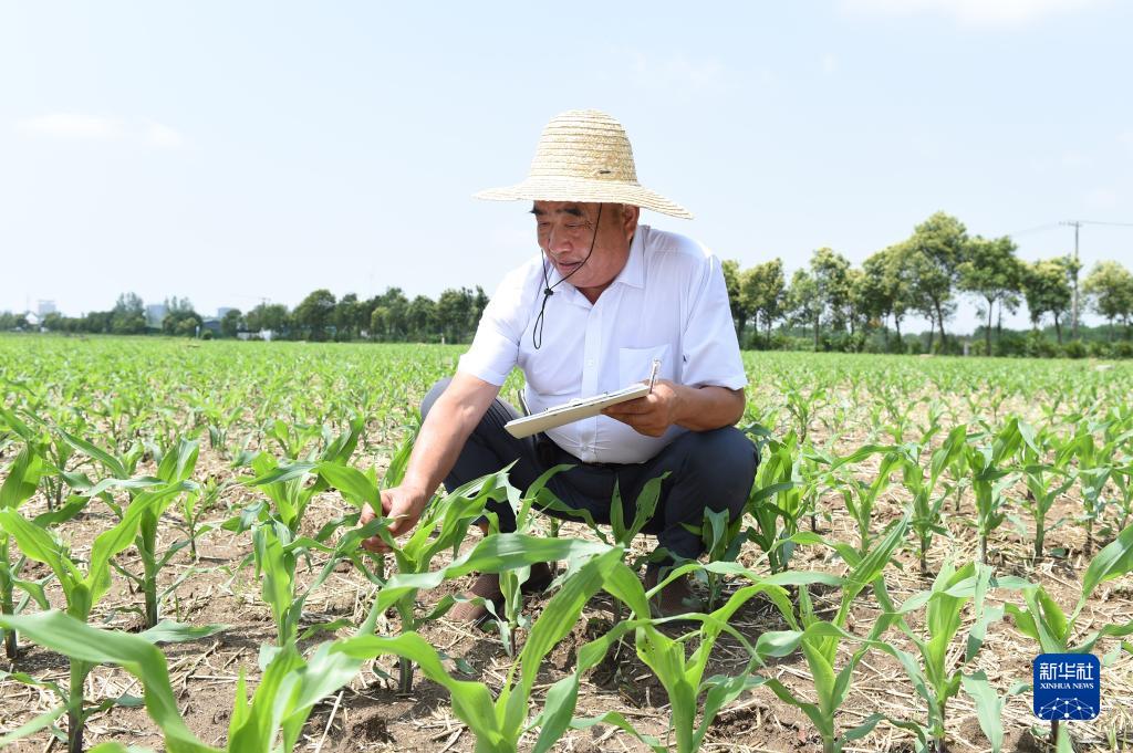 在安徽省阜陽市太和縣舊縣鎮(zhèn),徐淙祥在淙祥現(xiàn)代農(nóng)業(yè)種植專業(yè)合作社的高產(chǎn)攻關(guān)示范田里查看苗情(6月28日攝)。新華社記者 周牧 攝