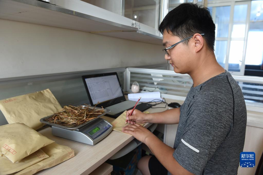在安徽省阜陽市太和縣舊縣鎮(zhèn),徐旭東在實(shí)驗(yàn)室對農(nóng)作物樣品進(jìn)行稱重和記錄(6月28日攝)。新華社記者 周牧 攝