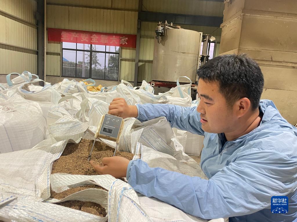 7月7日,安徽省滁州市天長市種糧大戶平東林在秸稈炭化廠房用水分測定儀檢測秸稈炭粉水分指標(biāo)。新華社發(fā)(朱禮明 攝)